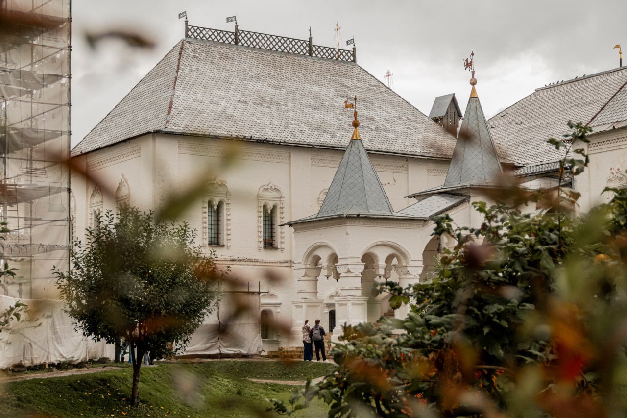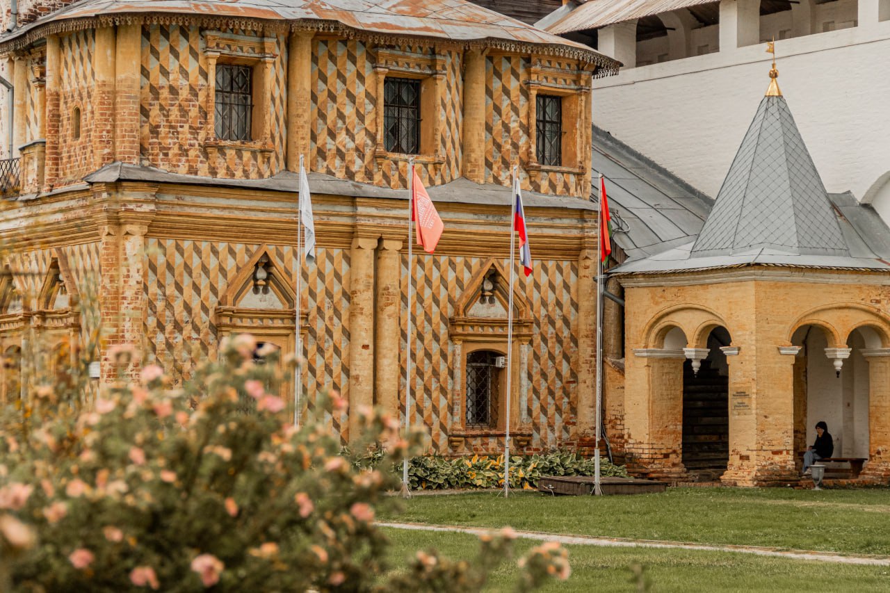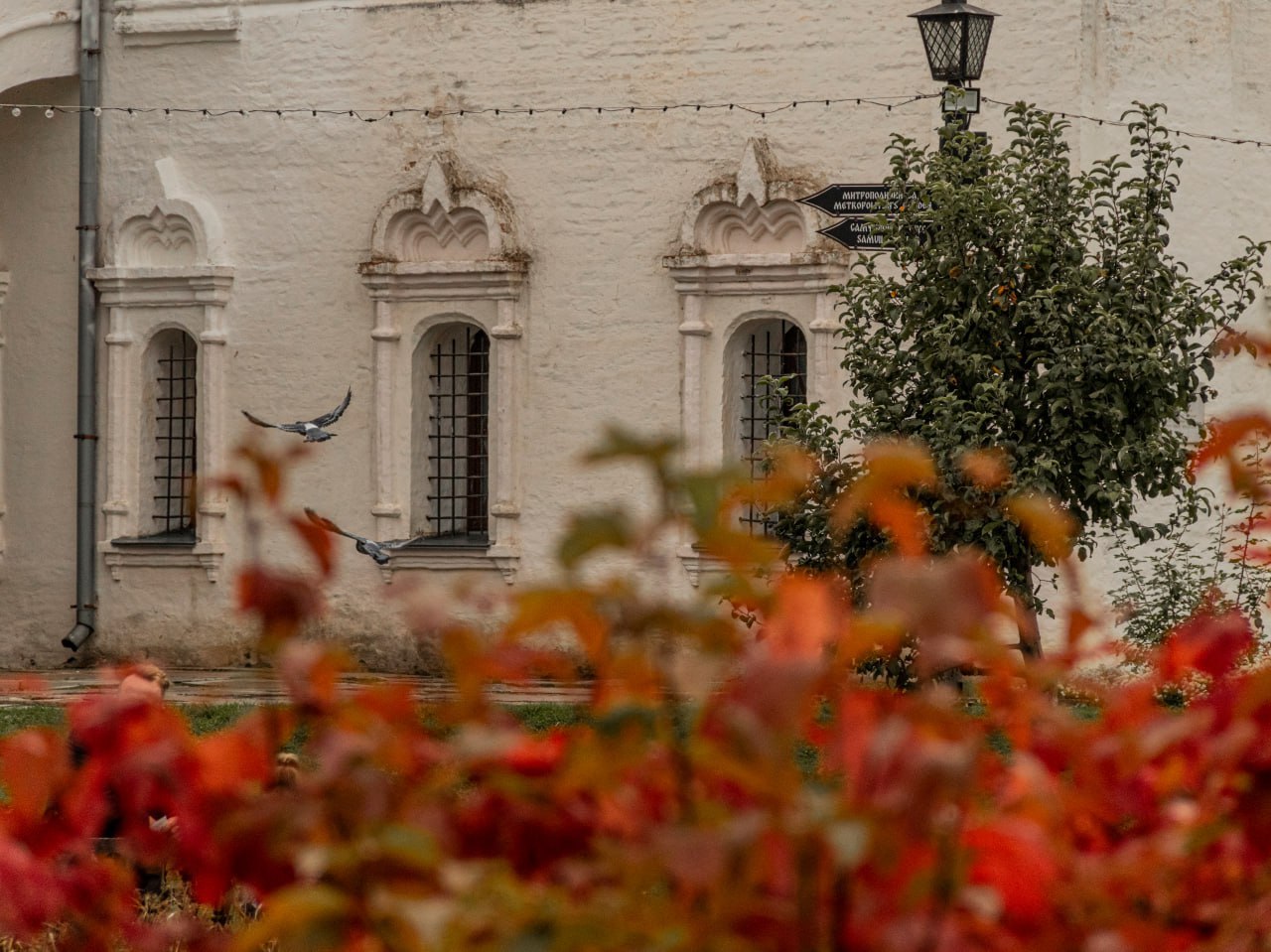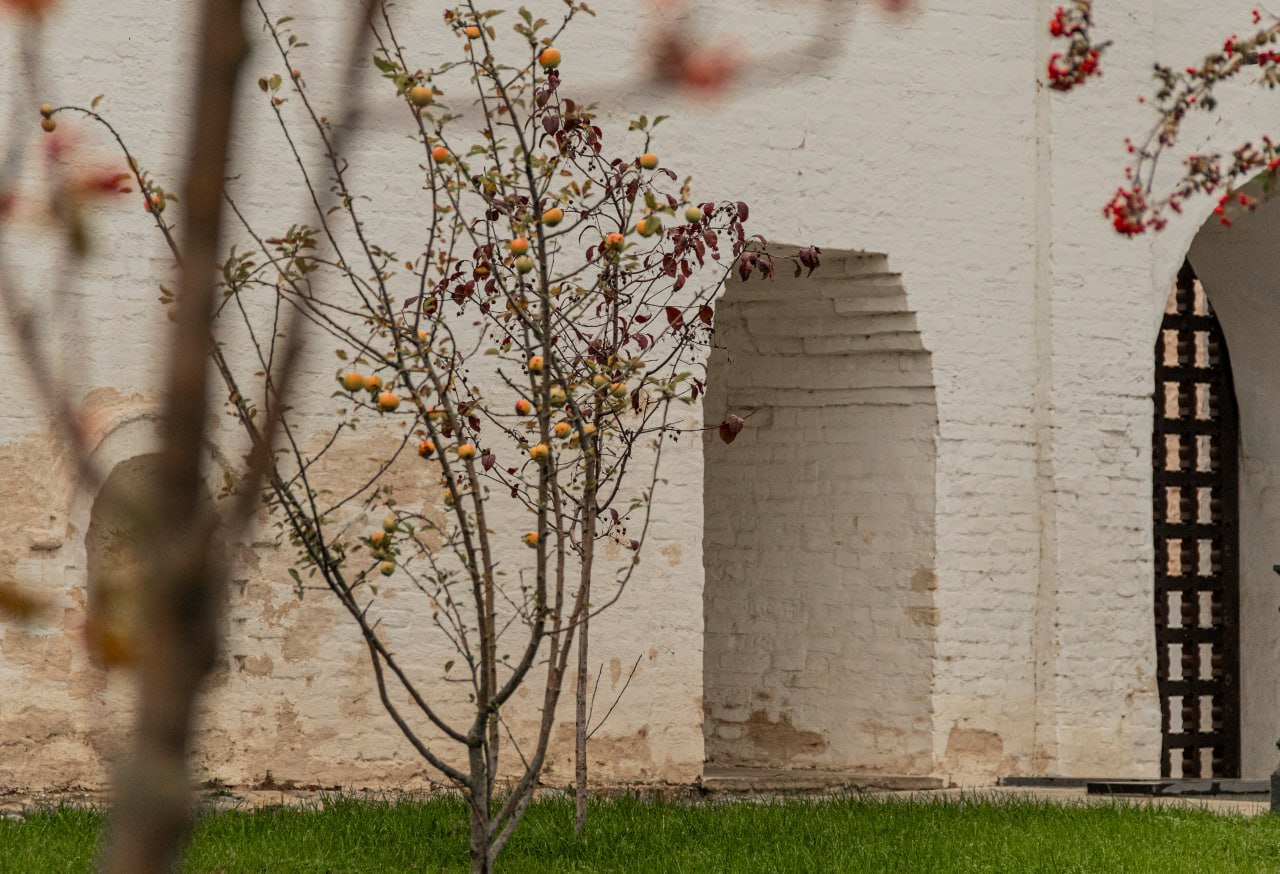 Осень в Ростовском Кремле представляет собой палитру красок, где рябина, словно яркий акцент, выделяется на фоне древних стен и золотых опадающих листьев.