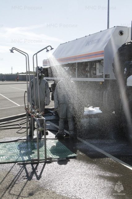 Первой точкой осмотра стала площадка, на которой специалисты отрабатывали ликвидацию условного РХБ-заражения. Были представлены техника и оборудование для ликвидации последствий подобных ЧС, обеспечения продовольственной безопасности, обеззараживания поверхностей и воды.