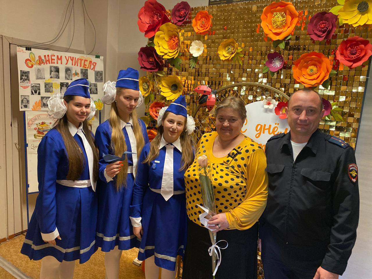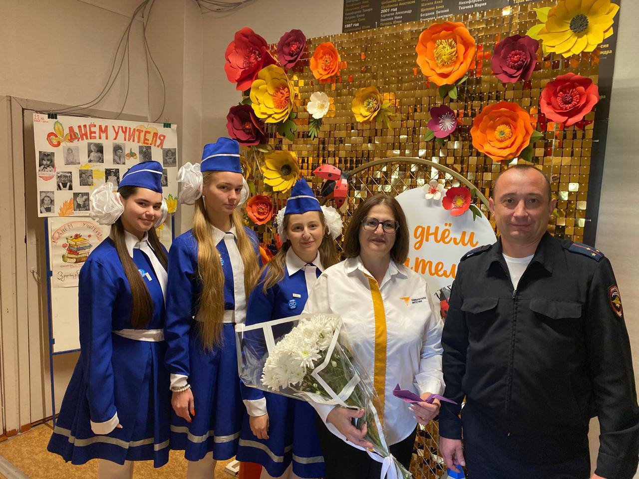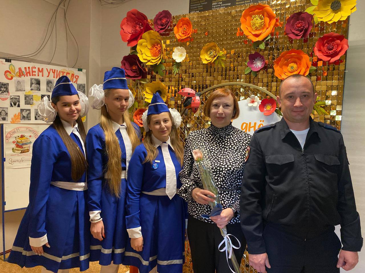 Отряд ЮИД вместе с инспектором по пропаганде БДД Отделения Госавтоинспекции МО МВД России «Каменский», старшим лейтенантом полиции Александром Новиковым, поздравили педагогов и муниципального координатора проекта «Навигаторы детства» Оксану Владимировну Ганулину.