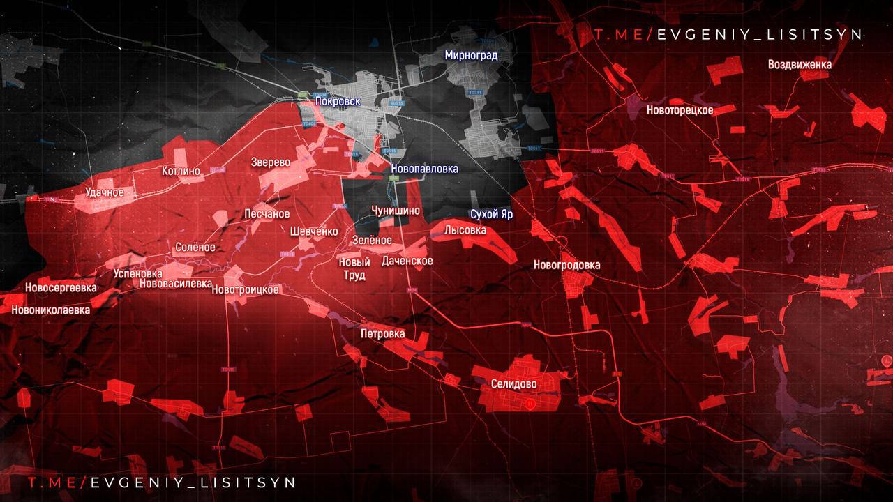 На Покровском фронте ВС РФ продвигаются к Мирнограду и Новопавловке, закрепились у шахты «Капитальная». Подтверждено освобождение Владимировки, бои идут у Лысовки и Чунишино.