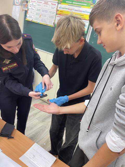В ходе урока Виктория Геннадьевна представила учащимся различные инструменты, необходимые для обнаружения и сбора важной информации, такие как дактилоскопические порошки, кисточки, лупы, линейки, пинцеты и фонарики.Она объяснила, как эти предметы помогают в выявлении следов рук, что является важной частью работы криминалистов. Затем сотрудник полиции провела практическое занятие, на котором школьники смогли попробовать изъять следы пальцев рук с использованием дактилоскопического порошка.