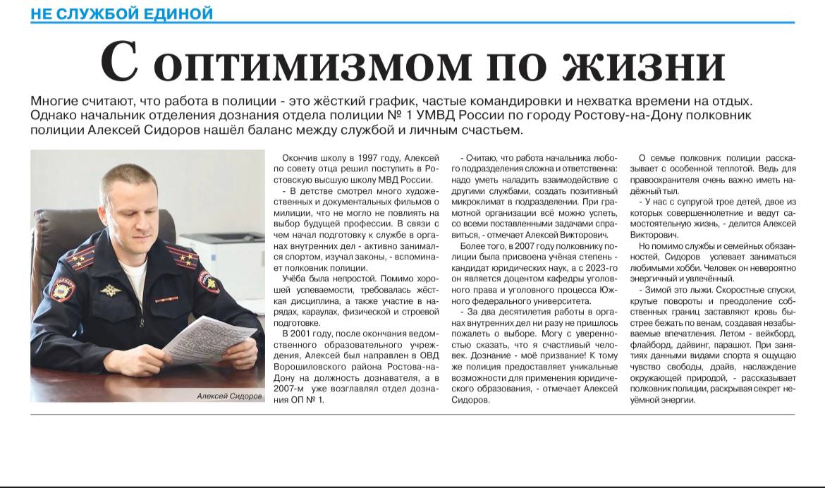 В День образования службы дознания в системе МВД России газета «Щит и Меч» представляет эксклюзивный материал о начальнике Отдела дознания Отдела полиции № 1 Управления МВД России по городу Ростову-на-Дону Алексее Сидорове.