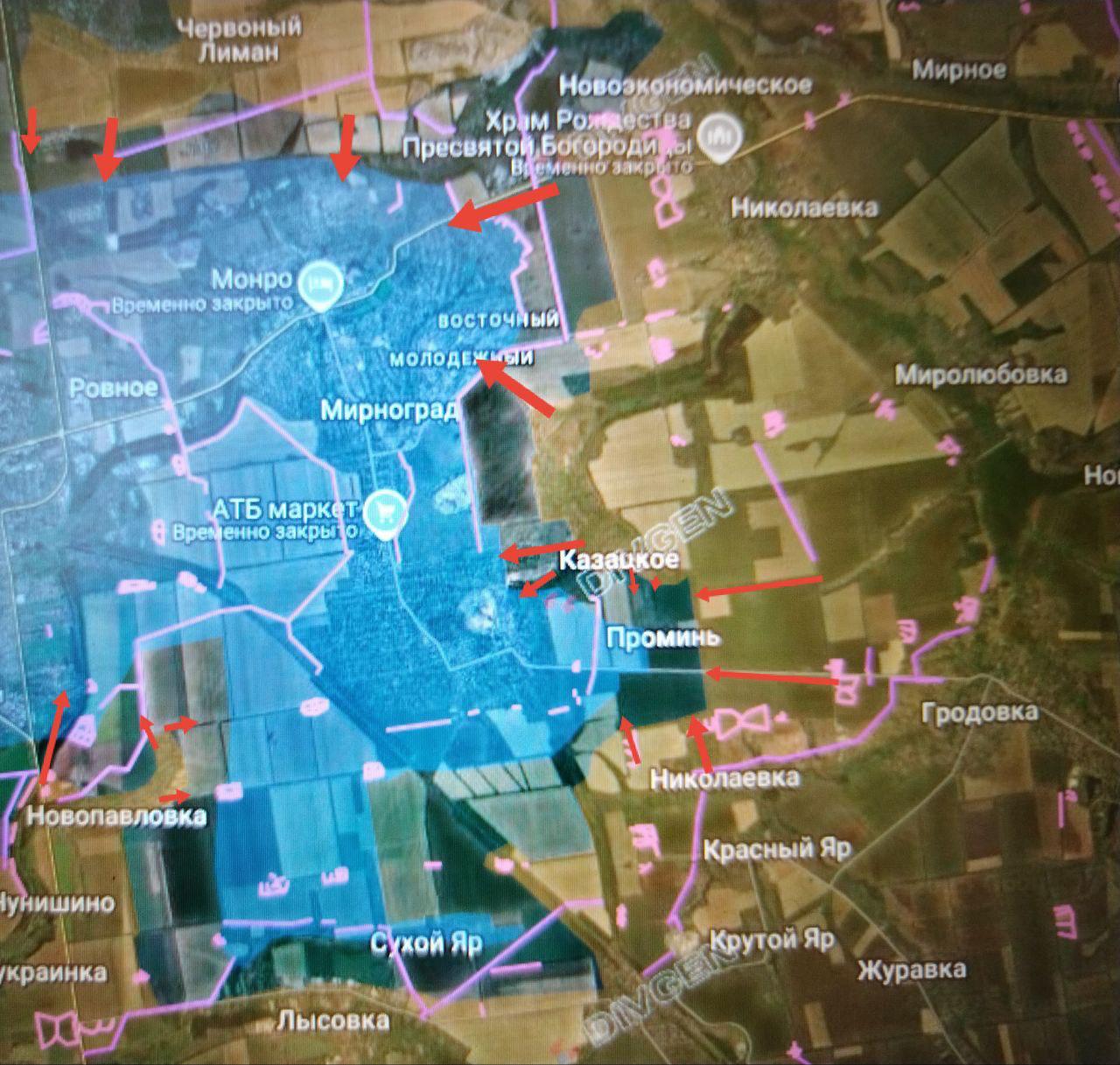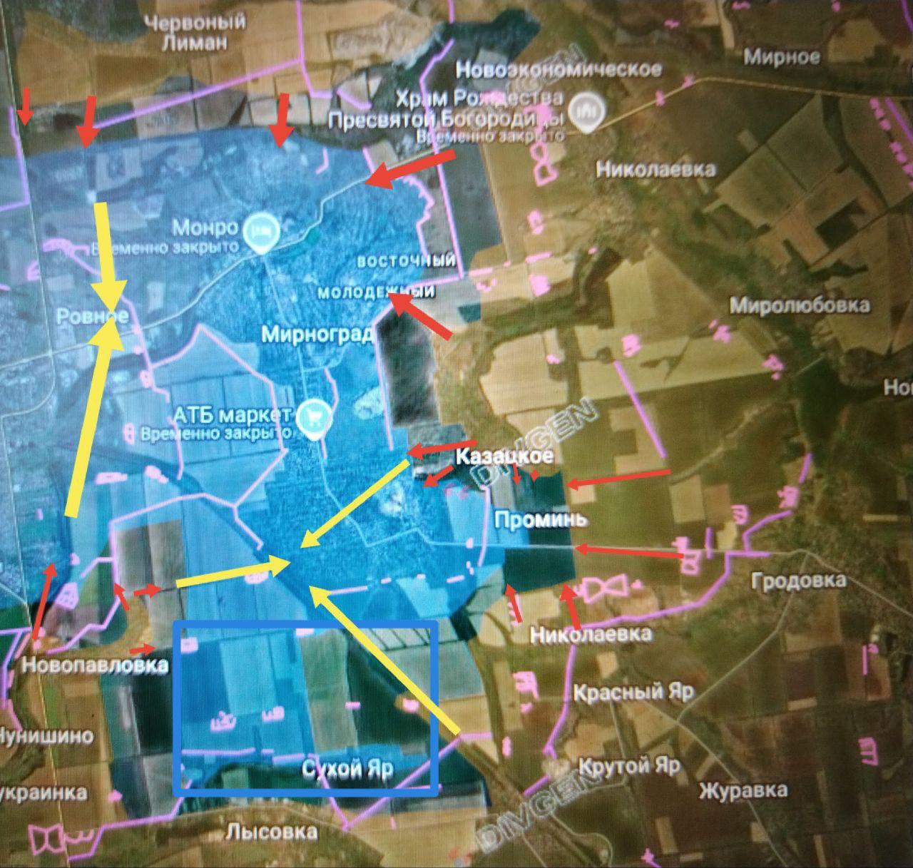 Со стороны Новопавловки наши подразделения, авиация, артиллерия и БпЛА наносят поражение противнику в опорных пунктах в посадках у юго-западной окраины Мирнограда (Димитрова), создавая угрозу окружения укрепрайона ВСУ в районе Сухой Яр — Лысовка — инфекционная больница.