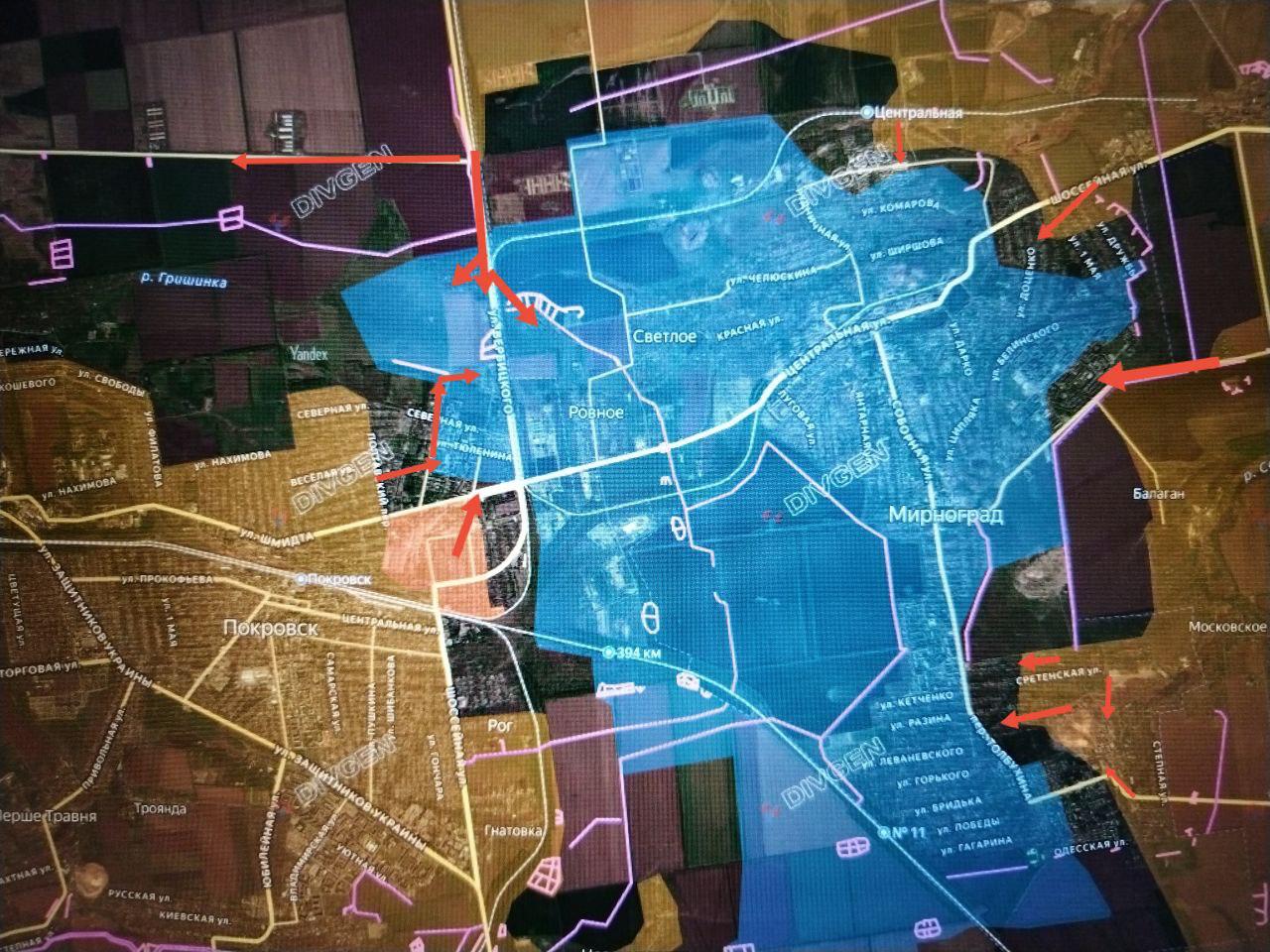 По информации околовоенных ресурсов противника, ВСУ получили команду отходить, оставив подразделения прикрытия, из Покровска (Красноармейска) в Мирноград (Димитров), который они должны удерживать любой ценой ещё неделю (если поверят Сырскому, что в течение этого времени их деблокируют). Только отойти в Димитров "могут уже далеко не все", т.к. заблокированы и окружены.