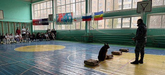 Сотрудник кинологической службы и его питомец продемонстрировали студентам элементы дрессуры. Служебная собака показала свои навыки, четко выполняя команды сотрудника полиции.