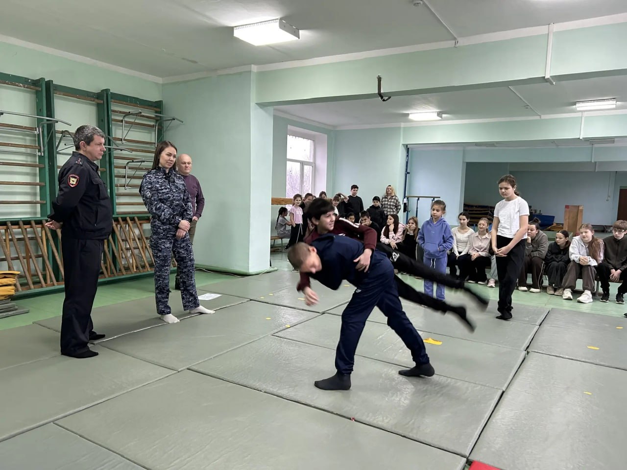 В ходе встречи школьников научили оказывать первую помощь пострадавшим, порядок наложения жгутов и давящих повязок, рассказали о видах кровотечений.Кроме того, ребятам были показаны боевые приемы борьбы, которые изучают и применяют в своей служебной деятельности сотрудники полиции.