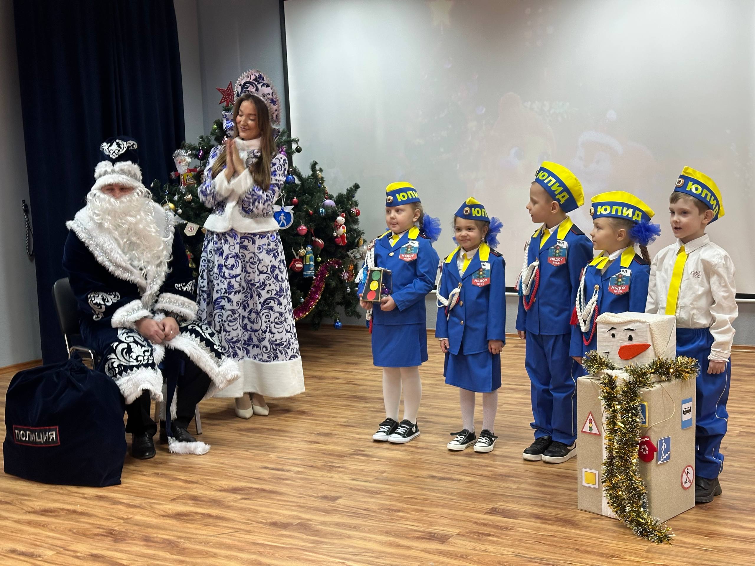 Сказочные гости — Дед Мороз и Снегурочка — в игровой форме повторили с ребятами основы безопасного поведения на дороге, а маленькие гости в ответ прочитали стихотворения, посвящённые ПДД.