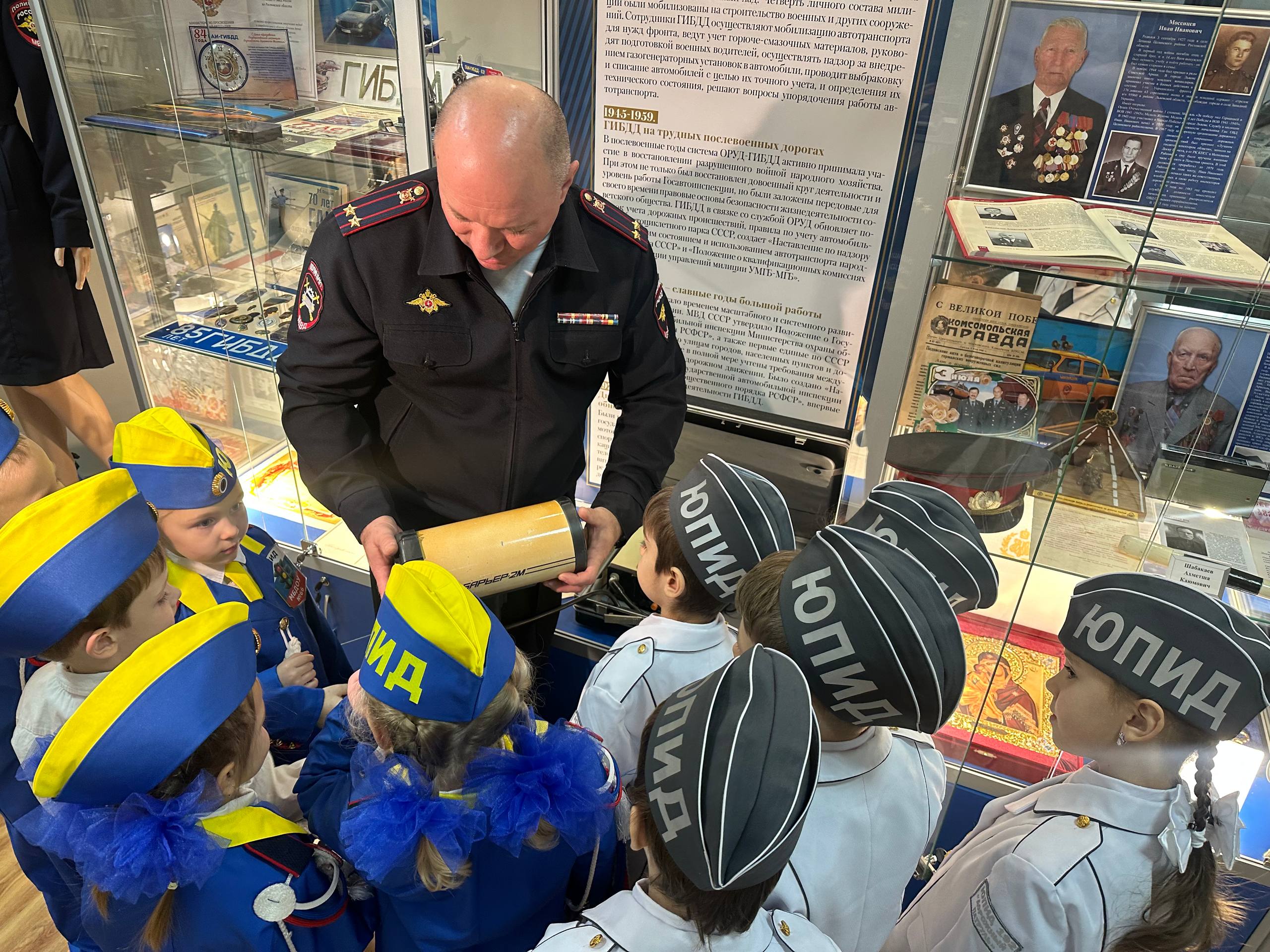 Настоящее путешествие в историю службы устроил начальник отдела пропаганды БДД Александр Мухин, проведя для детей увлекательную экскурсию по музею Госавтоинспекции.