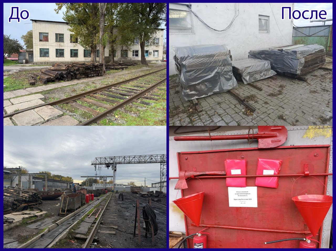 Установлены нарушения законодательства о безопасности эксплуатации железнодорожного транспорта, пожарной безопасности и в сфере охраны окружающей среды, выразившиеся в ненадлежащем содержании железнодорожных путей необщего пользования, хранении отработанных деревянных шпал на земляном покрове, отсутствии на участке для резки металла огнетушителей и покрывала для изоляции очага возгорания.