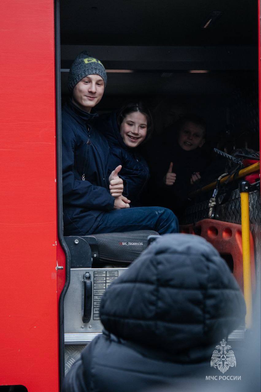 Вместе с новогодними персонажами приехали сотрудники МЧС России и добровольцы. Они подготовили для ребят не только подарки, но и провели урок безопасности, где рассказали об опасности игр с огнём, познакомили с пожарной техникой. Ребята с восторгом исследовали машину спасателей, примеряли настоящие каски и пробовали держать пожарный ствол.