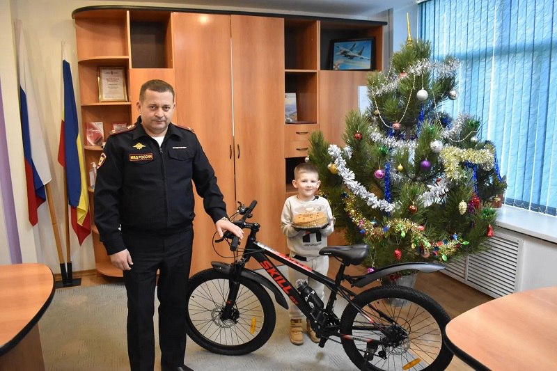 В рамках Всероссийской благотворительной акции «Елка желаний» в Межмуниципальном отделе МВД России «Морозовский» юному жителю города Морозовск Александру Скрынникову сотрудники полиции подарили новогодний подарок - велосипед.