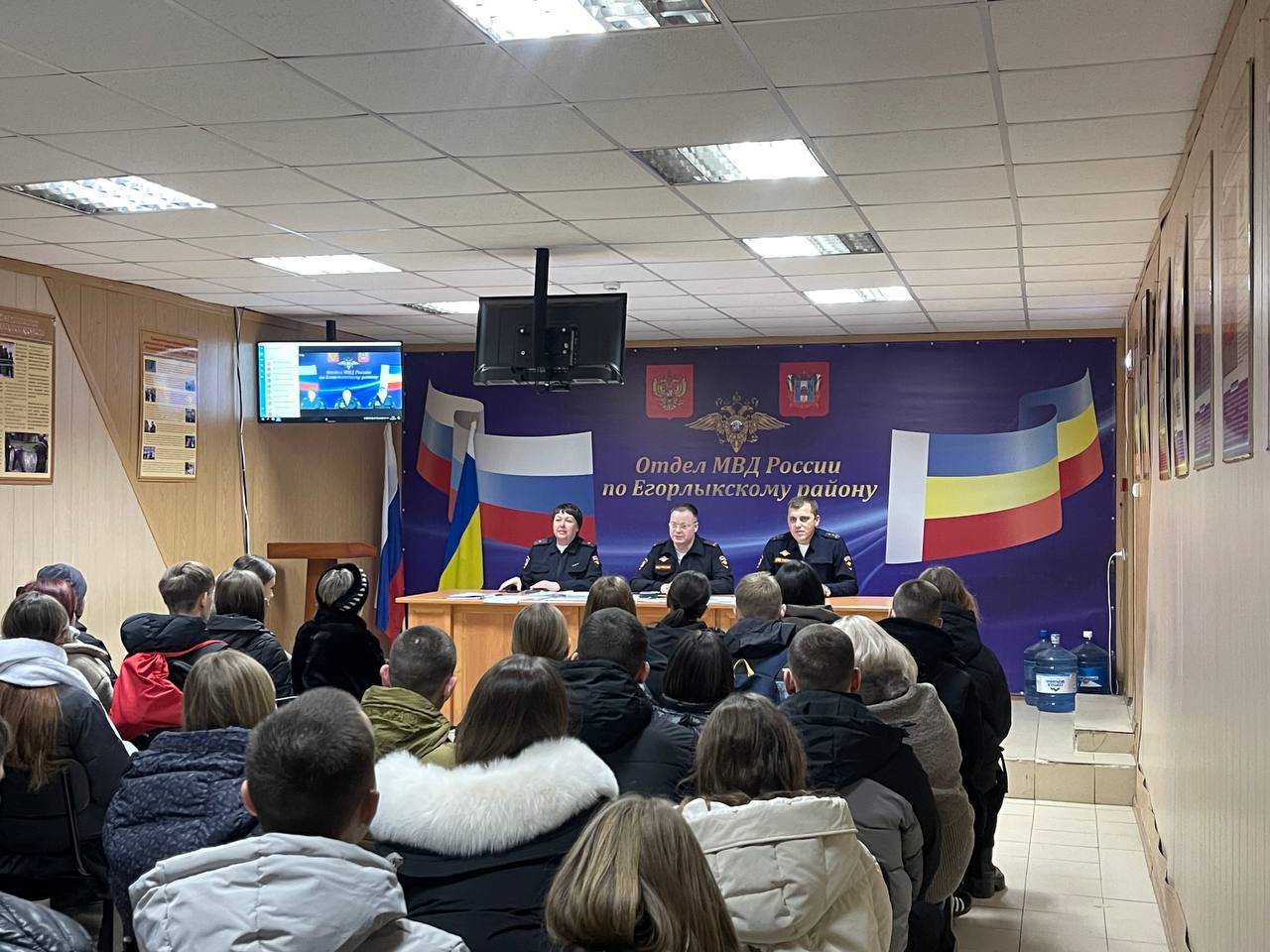 Также в рамках проекта «С Новым годом, полиция!», сотрудники Отдела МВД России по Егорлыкскому району организовали проведения мероприятий с выходом полицейского класса МБОУ Егорлыкской СОШ № 1 в Отдел МВД России по Егорлыкскому району, где учащихся также поздравили с праздником, провели с ними профилактическую и воспитательную беседу, направленную на формирование уважительного отношения к закону, службе в органах внутренних дели принципам гражданской ответственности.