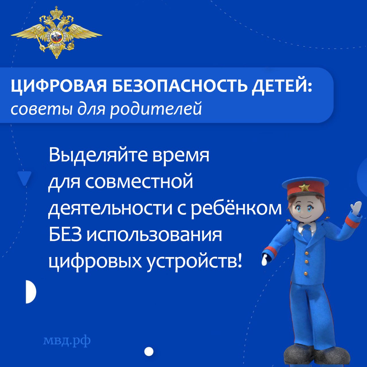 6 Родителям необходимо сознательно выделять время для совместной деятельности без использования цифровых устройств. Это могут быть прогулки, спортивные и настольные игры, чтение или беседы. Все это не может стать заменой Интернету, но при этом формирует у ребенка доверие и чувство опоры в семье. А это, в свою очередь, повышает его устойчивость к манипуляциям и другим рискам в виртуальной среде.