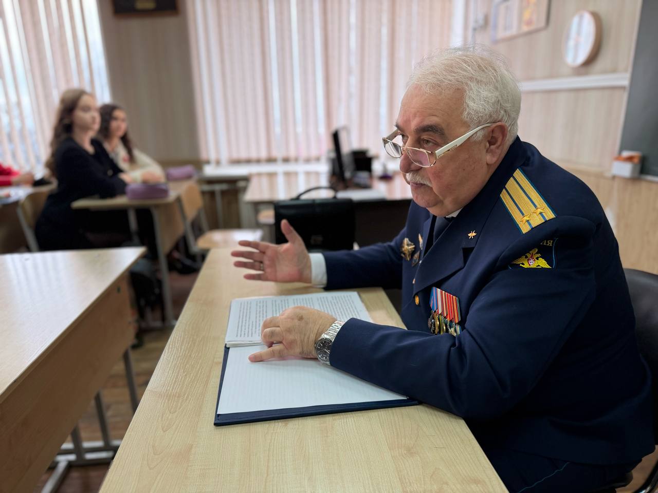 Занятие для учащихся, в числе которых кадеты Следственного комитета, юнармейцы провел почетный гость — ветеран военной службы, ветеран боевых действий, ветеран следственных органов Симхаев Семен Яирович. Семен Яирович - офицер, большую часть жизни посвятивший службе в Вооруженных Силах Министерства обороны Российской Федерации. Являясь подполковником запаса он удостоен высокой государственной награды — ордена «За военные заслуги».