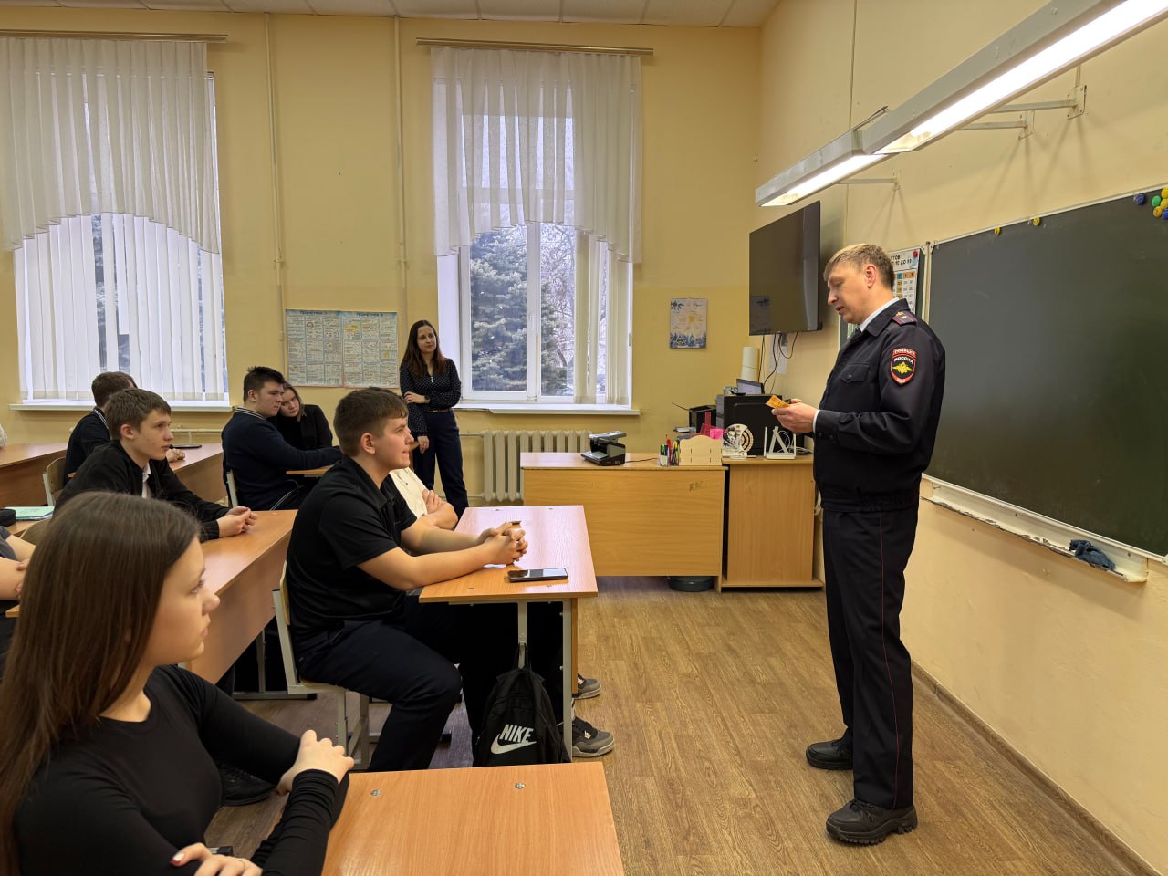 В новочеркасской школе № 3 прошло практическое занятие для учеников «полицейского класса». Перед будущими правоохранителями выступил заместитель начальника экспертно-криминалистического отдела Межмуниципального управления МВД России «Новочеркасское» майор полиции Игорь Зиновьев.