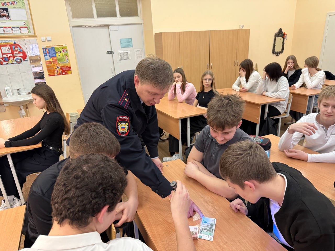 Правоохранитель подробно рассказал о том, как в реальной практике выявляются поддельные купюры, какие элементы защиты проверяются в первую очередь и какое оборудование используется при криминалистическом исследовании денежных знаков. Теория была подкреплена примерами из служебной практики.Ребята при помощи фонарика и аппарата для проверки подлинности денежных средств проверили банкноты, рассмотрев элементы защиты в виде водяных знаков и микроперфорации на бумажной купюре.