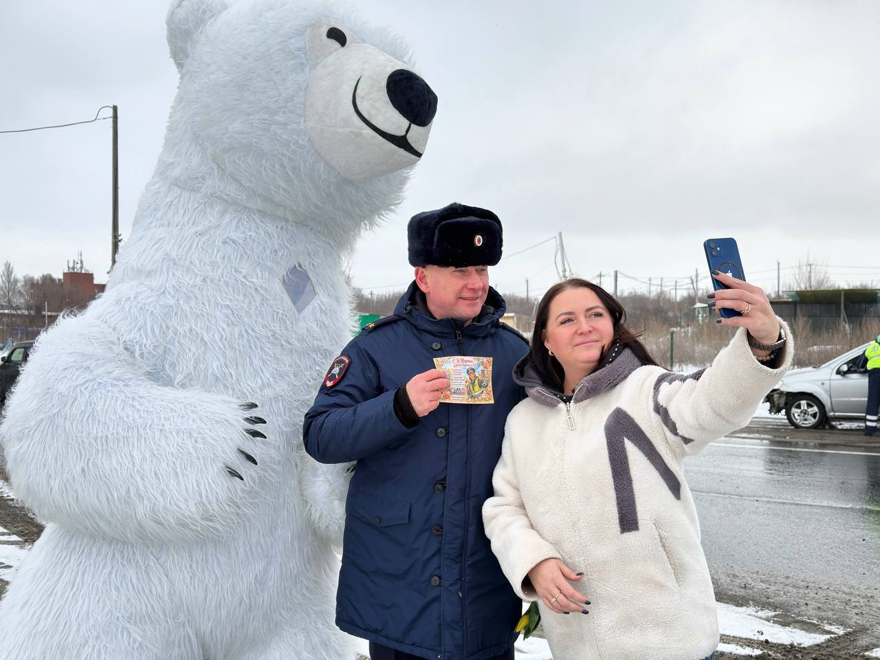 Необычный персонаж составил компанию сотрудникам Госавтоинспекции в Самарской области. Здесь поздравлять женщин-водителей с наступающим праздником в составе «Цветочного патруля» вышел ростовой «медведь», который обнимал водителей, желал счастливого пути, вручал цветы и стал героем многочисленных селфи.