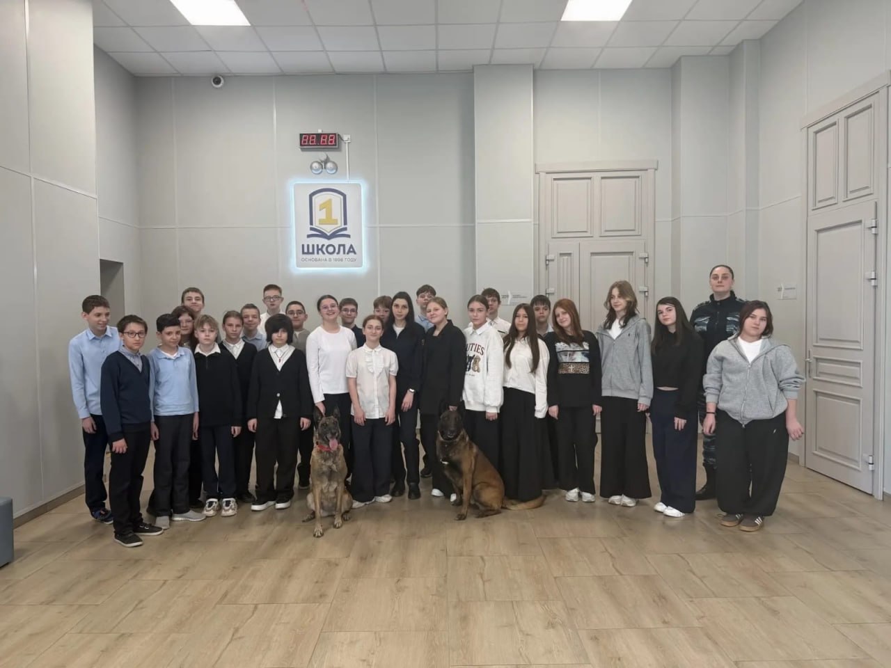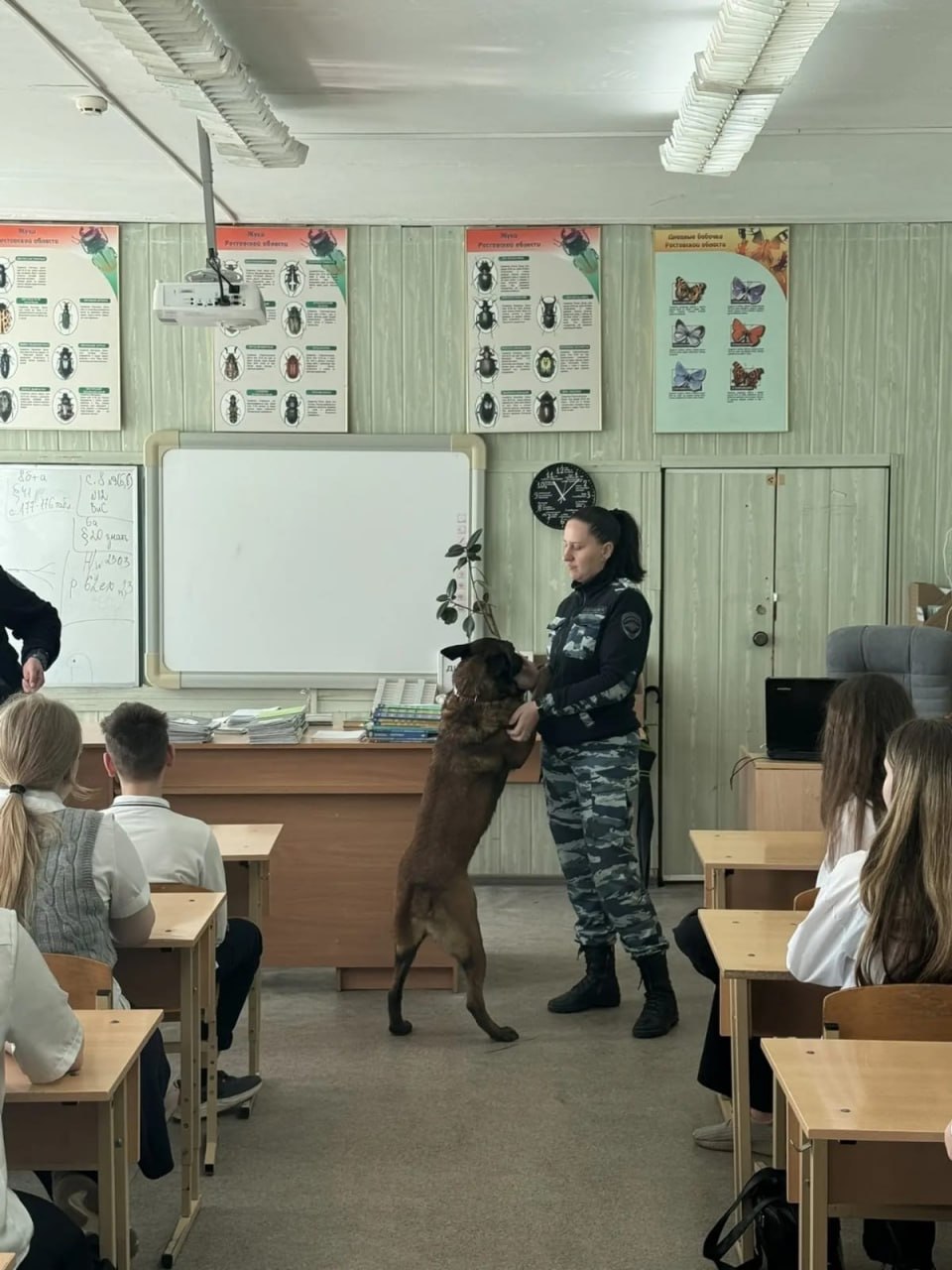 В гостях у школьников побывали старший инспектор отделения обнаружения и обозначения целевых объектов по их запаху ЦКС Управления МВД России по городу Ростову-на-Дону капитан полиции Анна Столбовая совместно со своей напарницей — служебной собакой по поиску целевых веществ (ВВ, ВУ) породы бельгийская овчарка «малинуа» по кличке Ариста Геката — продемонстрировали ребятам элементы работы специалиста-кинолога.