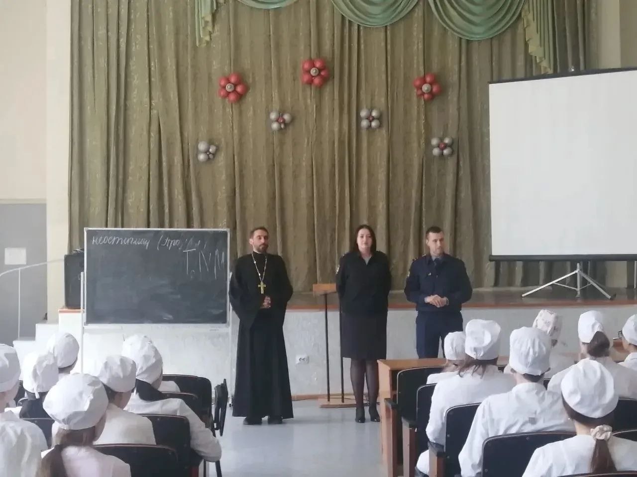 Перед учащимися выступили представители полиции, член Общественного совета при территориальном органе Иван Харченко и настоятель храма Рождества Пресвятой Богородицы.