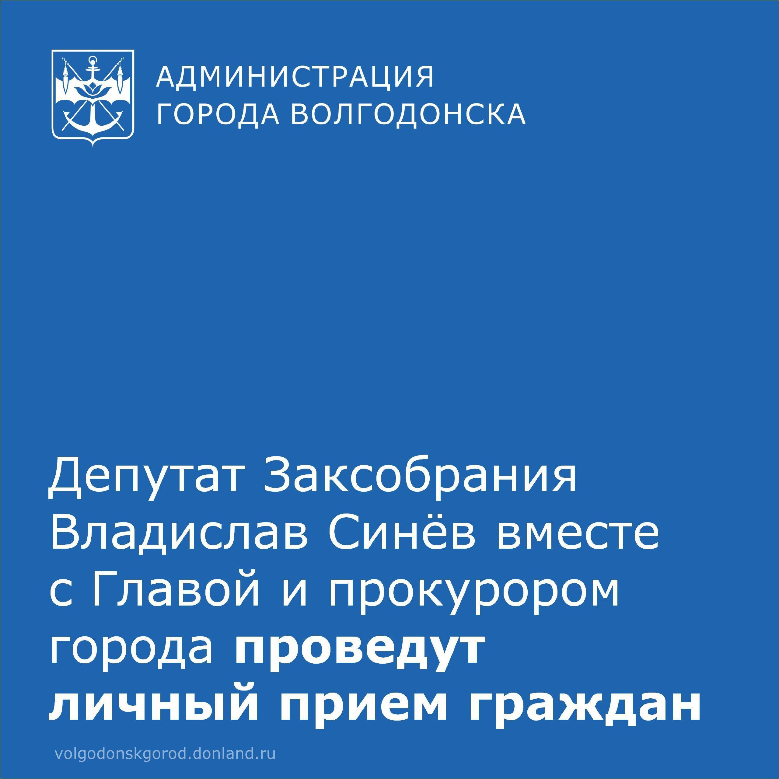 Напоминаем, что сегодня депутат Законодательного Собрания Ростовской области Владислав Синёв совместно с Главой города и прокурором Волгодонска проведут личный прием граждан.
