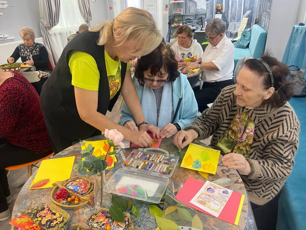 После поздравлений и чаепития прошёл мастер-класс по созданию осенних корзинок с элементами палехской росписи.
