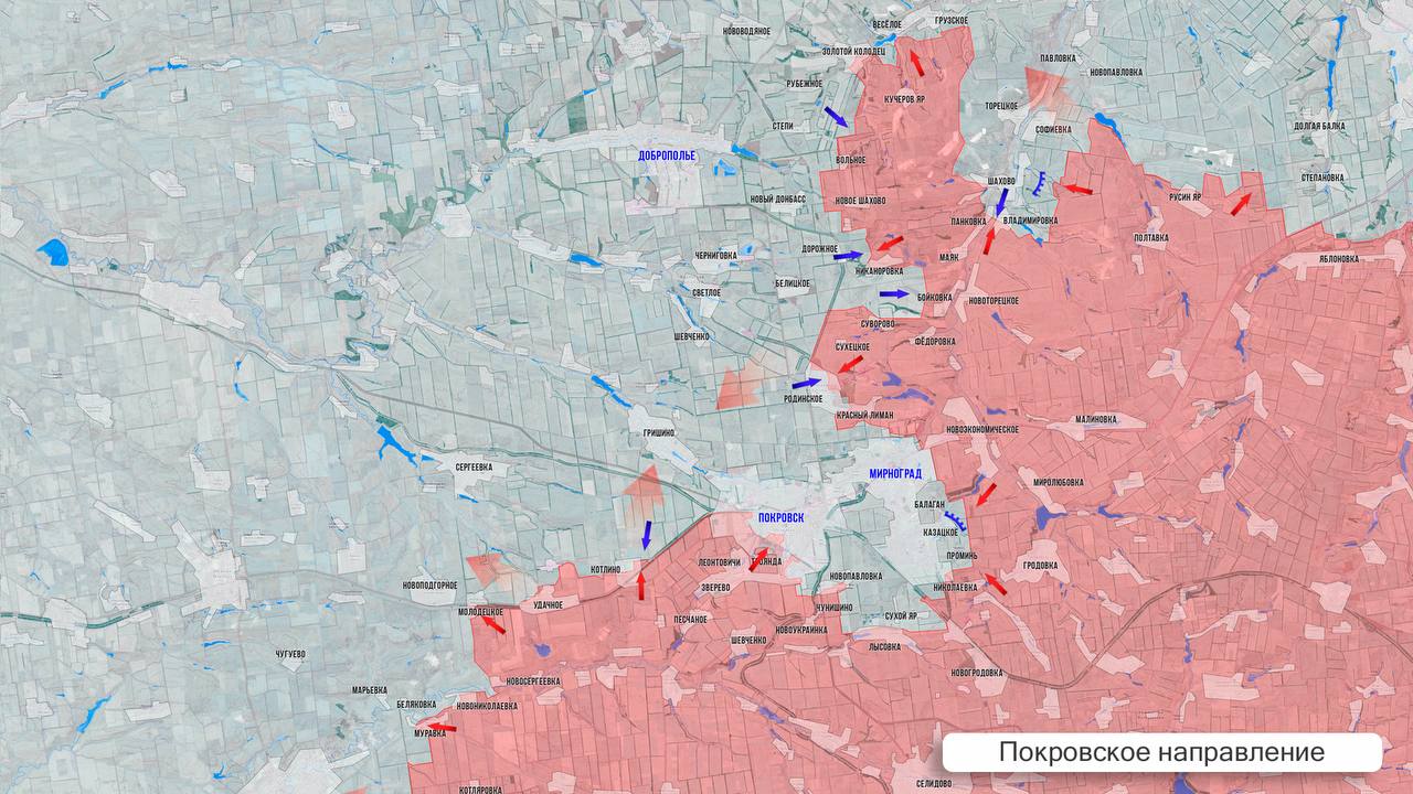 На западном участке Покровского фронта ВС РФ ФАБами снесли многометровые копры шахты «Красноармейская- Западная №1» — башни над шахтным стволом для подъёмной машины. Их высоту операторы БПЛА ВСУ использовали для контроля «малого неба» в районе Удачное-Котлино. Под Покровском наши штурмуют Чунишино, Лысовку, наступают в направлении Новопавловки. Основные бои разворачиваются восточнее Покровска: ВС РФ продвинулись из района Гродовки к Московскому и наступают на восточные окраины Мирнограда, закрепились в районе вентствола шахты «Капитальная». Продолжается наступление наших на Владимировку-Софиевку-Новопавловку. С мест сообщают об освобождении Владимировки, ждём подтверждения.