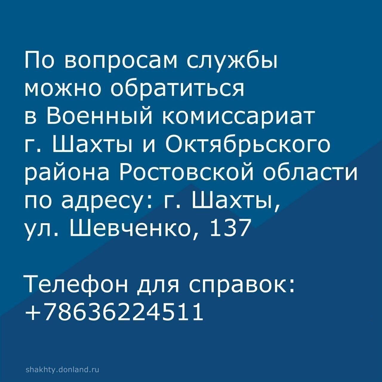 По вопросам службы можно обратиться в Военный комиссариат г. Шахты и Октябрьского района Ростовской области по адресу: г.Шахты, ул. Шевченко, 137.