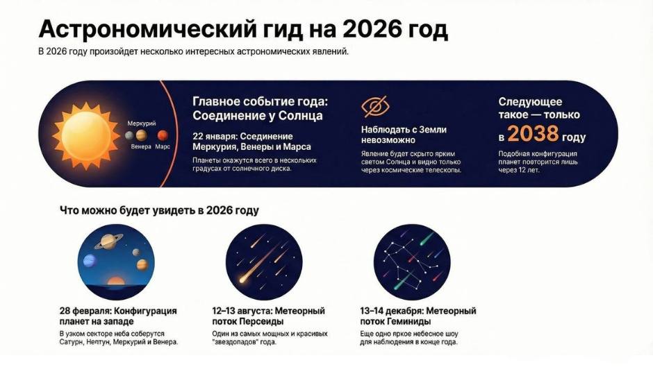 В следующий четверг, 22 января, ожидается редкое астрономическое явление. Меркурий, Венера и Марс встретятся вблизи Солнца.