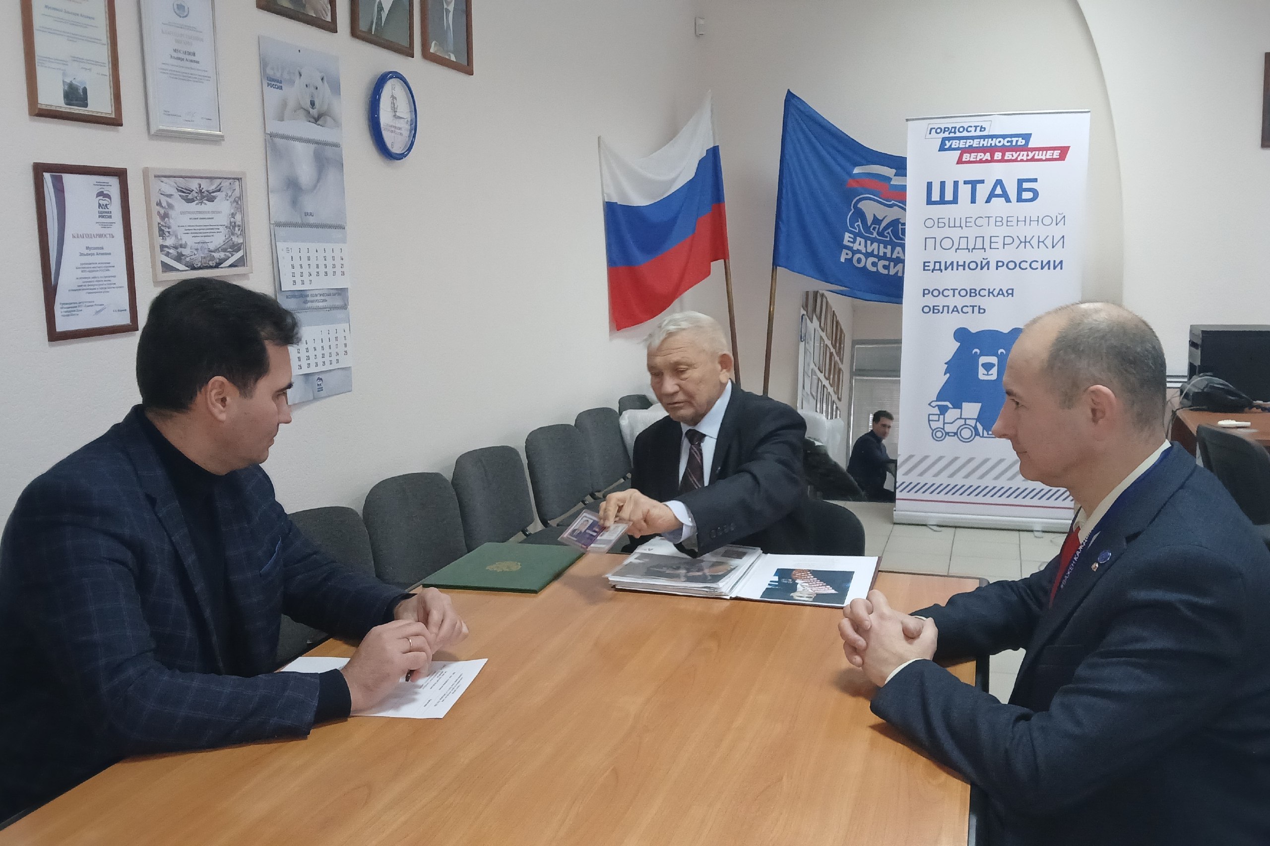На приеме были Анатолий Богданов и Виталий Рудь, представляющие общественную организацию «Патриоты Дона». Обсуждались вопросы, связанные с увековечиванием имени прославленного Олимпийского чемпиона Василия Ивановича Алексеева, реализации патриотических инициатив и деятельности общественной организации.