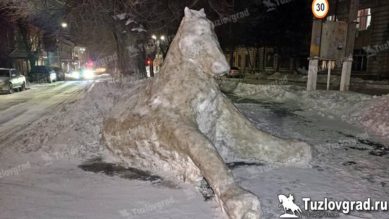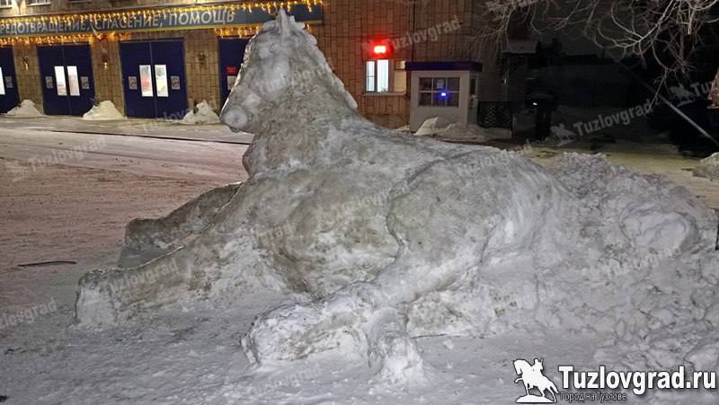 Спокойное дежурство выдалось у пожарного Сергея Шельпова в ночь на 27 января. Но он нашел, куда деть руки и энергию - слепил у своей части №28 в Новочеркасске огромного белоснежного коня. Причем, его не остановил мороз в -17°C и ледяной ветер - руки мастера замерзли так, что он перестал их чувствовать, но творение свое закончил.