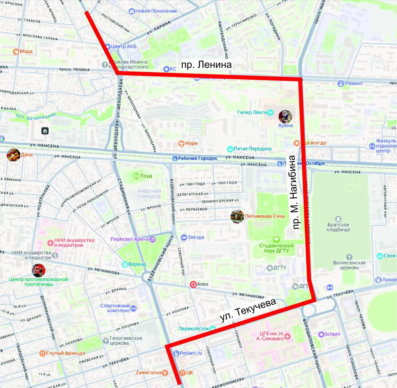 Движение временно организовано по схеме: пл. Народного Ополчения – пр. Ленина – пр. Михаила Нагибина– ул. Текучева – пр. Буденновский.