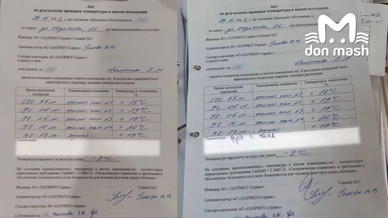 По закону схема такая: работник управляшки приходит и замеряет температуру в квартире. Составляет документ, на его основании сумму корректируют. Так и решила сделать ростовчанка Елена Долотова с Левенцовки. В двух детских, где стоят электрические обогреватели, было +19 °С. А вот в других комнатах — + 16°С. Цифры представитель УК "Патриот-сервис" внёс в бумагу, хозяйка подписала её (фото 1). Потом Елена узнала, что кто-то ДРУГОЙ ручкой и ДРУГИМ почерком накарябал в примечаниях: "Дует с окна" (фото 2). Никакого перерасчёта семья не получила — виноватыми в дубаке выставили их самих.