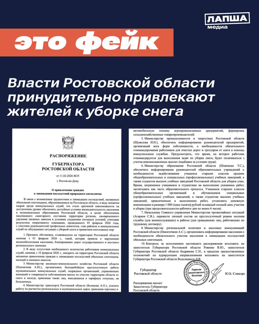 В Сети сообщают, якобы власти Ростовской области принудительно привлекают жителей к уборке снега, включая школьников, из-за масштабных снегопадов. В подтверждение приводятся видеообращение главы Ростова-на-Дону и «приказ» губернатора региона об обязательном участии населения в уборке.