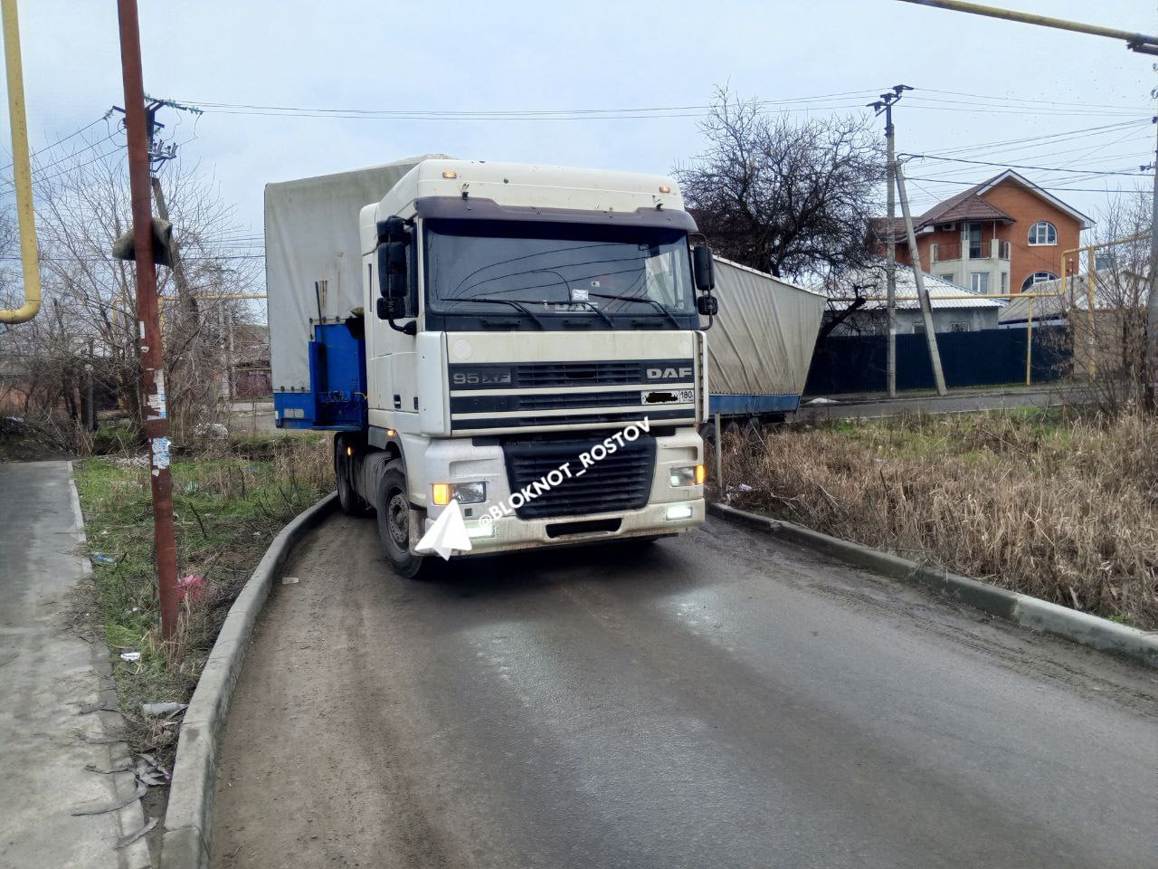 Большегруз с прицепом упал в канаву на улице Южной и перегородил всю дорогу.