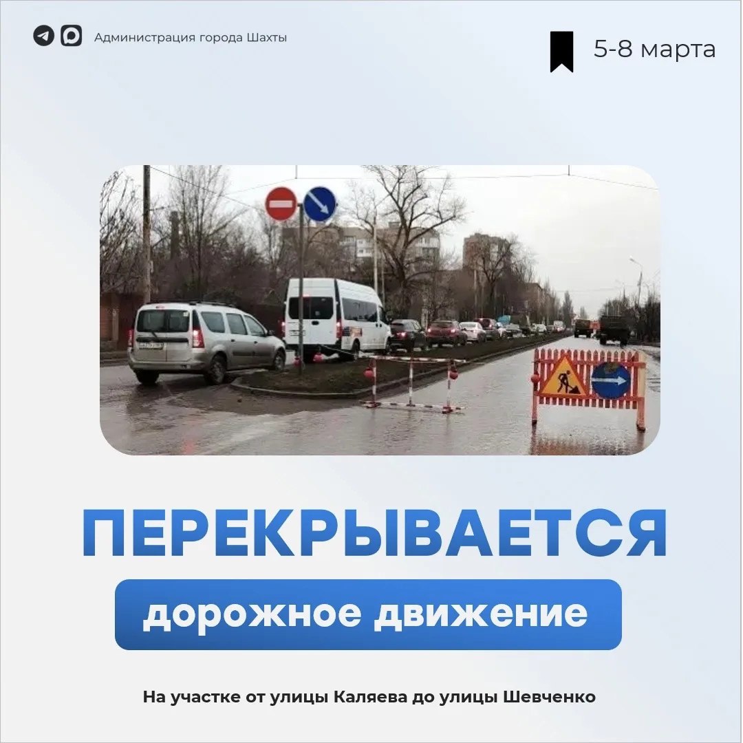 • С 5 по 8 марта закрыт проезд по участку дороги, ведущему от улицы Каляева к улице Шевченко.