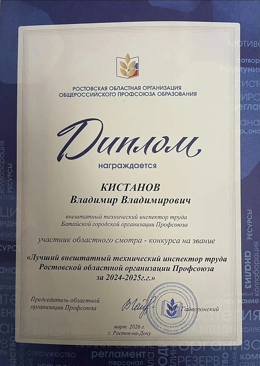 Батайчанин вышел в финал конкурса «Лучший внештатный технический инспектор труда профсоюза образования»