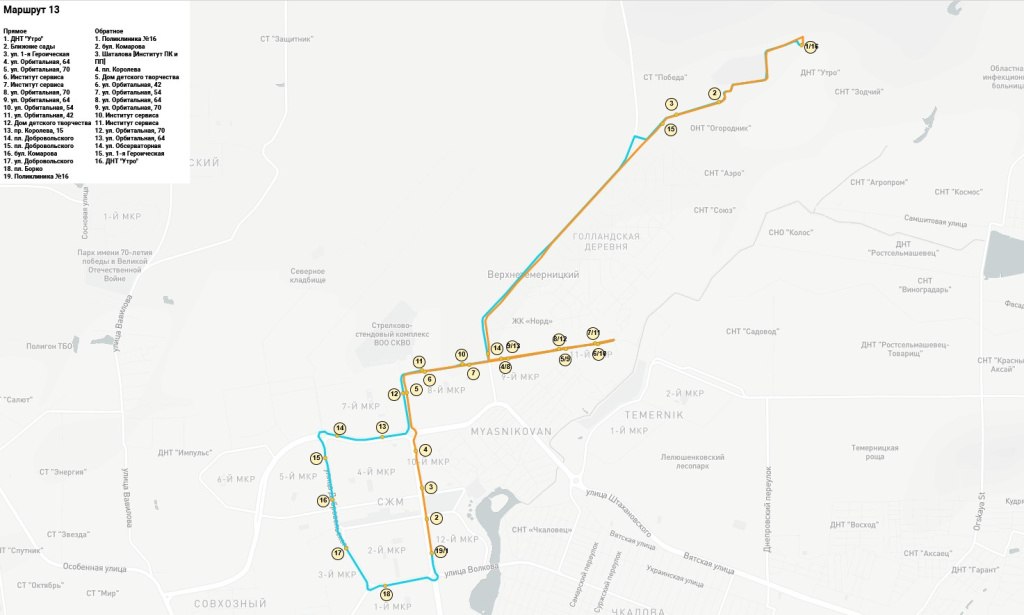 Новая схема: СНТ "Утро" – 6-я Престижная – 1-я Героическая – Обсерваторная – Орбитальная – Институт сервиса – Орбитальная – Космонавтов – Королева – Добровольского – Волкова – Космонавтов – Орбитальная – Институт сервиса – Орбитальная – Обсерваторная – 1-я Героическая – 6-я Престижная – СНТ "Утро".