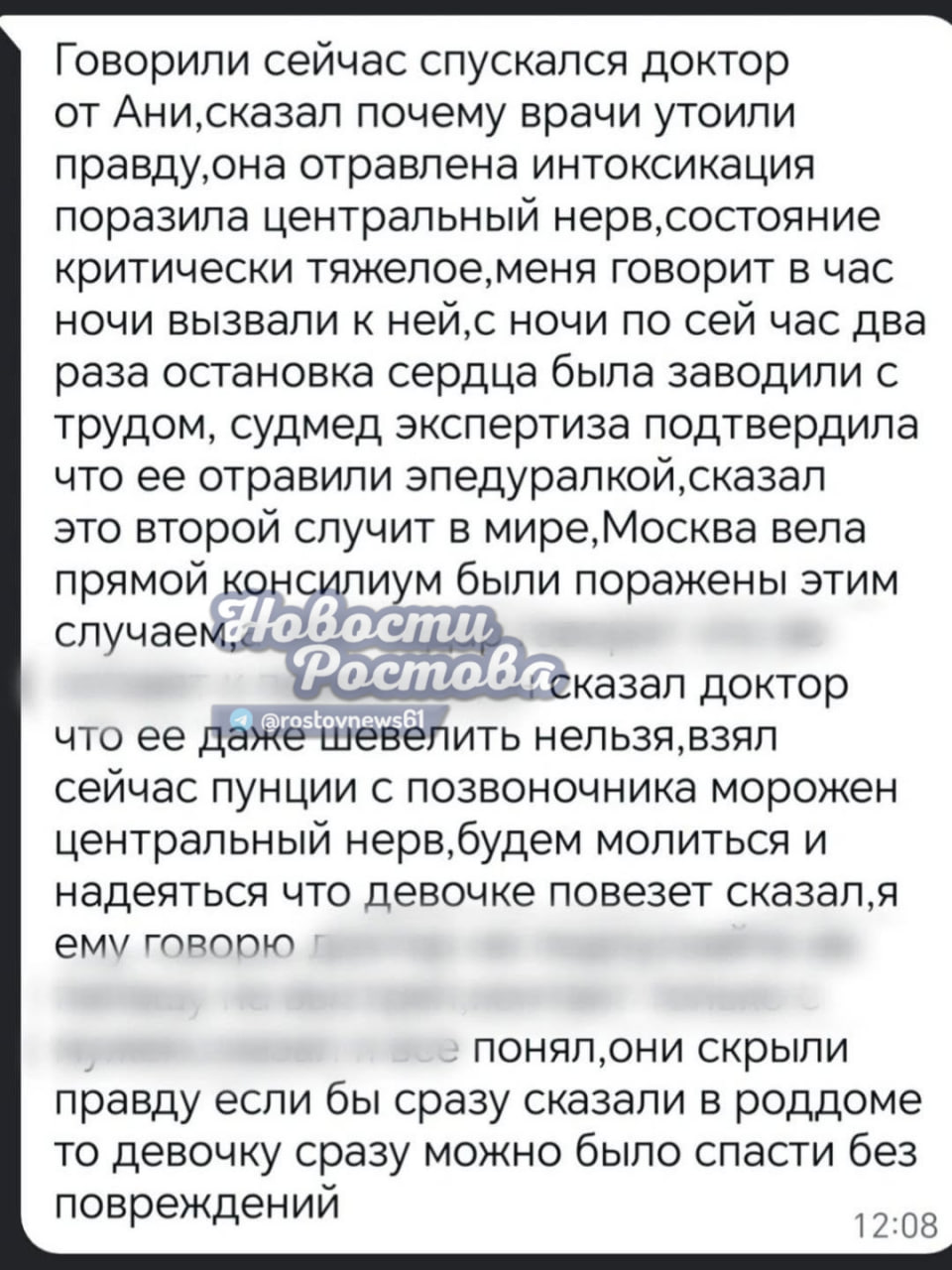Анну Малову доставили в роддом 5 апреля с начавшимися схватками. Во время подготовки к родам ей сделали эпидуральную анестезию, после чего ее состояние резко ухудшилось. Несмотря на это, врачи провели кесарево сечение — ребенок появился на свет здоровым.