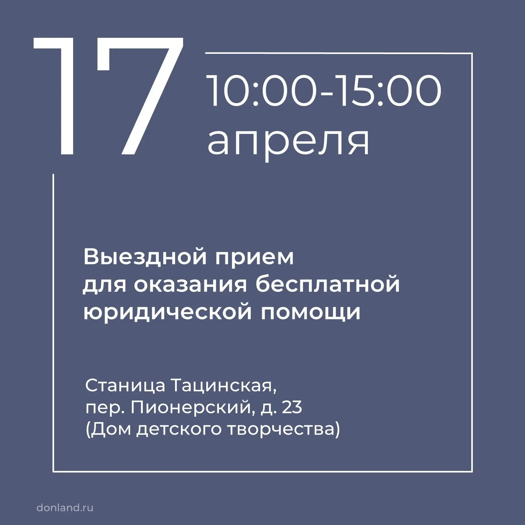 Первый прием пройдет 17 апреля с 10:00 до 15:00 по адресу: станица Тацинская, пер. Пионерский, д. 23 (Дом детского творчества Тацинского района).
