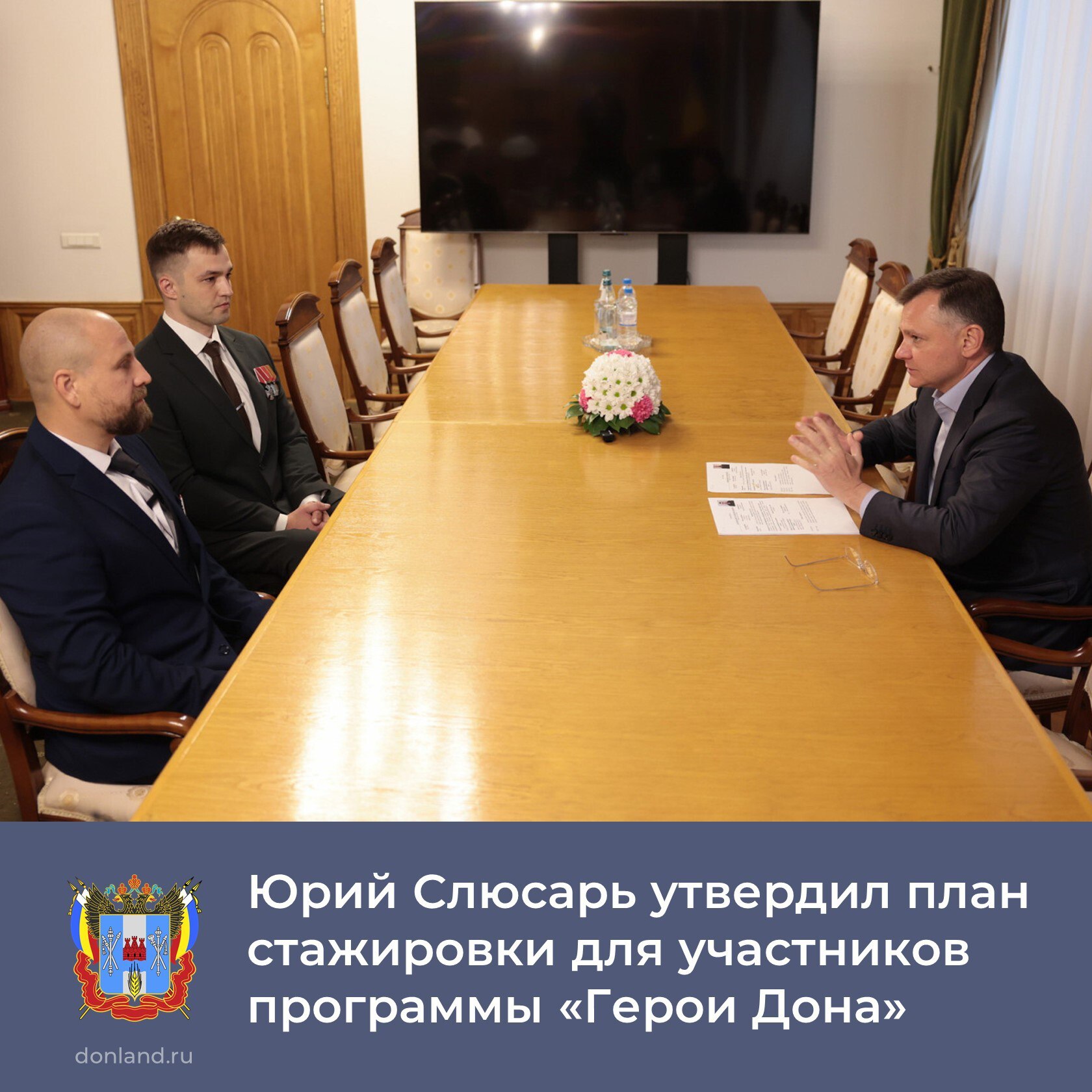 Губернатор Юрий Слюсарь провёл встречу с участниками программы «Герои Дона» - гвардии капитаном Константином Харченко и лейтенантом Михаилом Шевцовым, наставником которых он является.