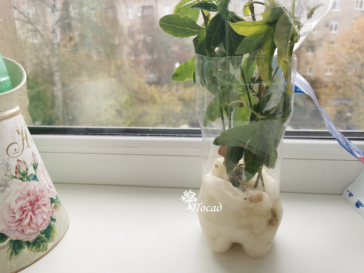 Спустя месяц ожидания в бутылке произошло неожиданное чудо: черенки начали пробуждаться к жизни, выпуская маленькие корешочки. Этот знак стал достаточным поводом для того, чтобы немедленно приступить к пересадке. Необходимо было действовать быстро, особенно учитывая, что финик, вырастившийся из косточки ранее, тоже сильно нуждался в пересадке.