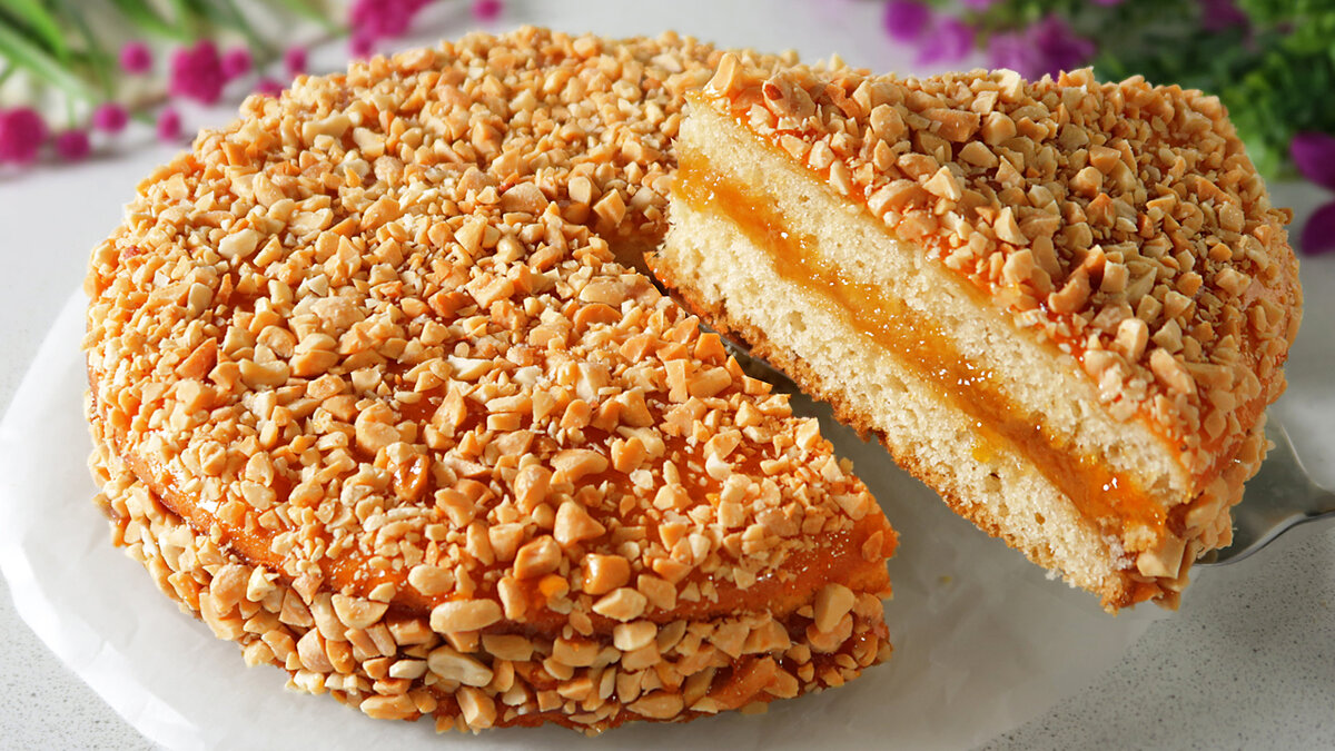 После завершения выпечки пирог нужно охладить. Верх щедро покрывается оставшимся вареньем и посыпается орехами. Этот лакомый кусочек потрясающе подойдет к чаю и станет настоящей находкой для любой вечеринки.