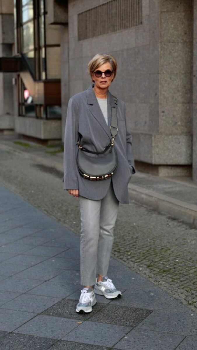 - Монохромный стиль: Прямые джинсы серого оттенка немного укороченной длины, дополненные базовой светлой футболкой и жакетом оверсайз более темного цвета, отлично подойдут для городской прогулки. Завершите образ кроссовками с серыми акцентами.