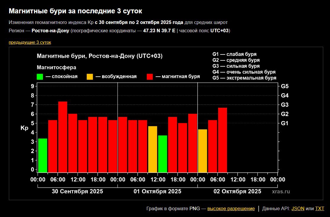 Магнитный шторм, который начался еще утром во вторник, продолжает третьи сутки бушевать на Земле. Буря держится в диапазоне G1-G3, что соответствует среднему уровню с отдельными сильными пиками, пояснили ученые ИКИ РАН.