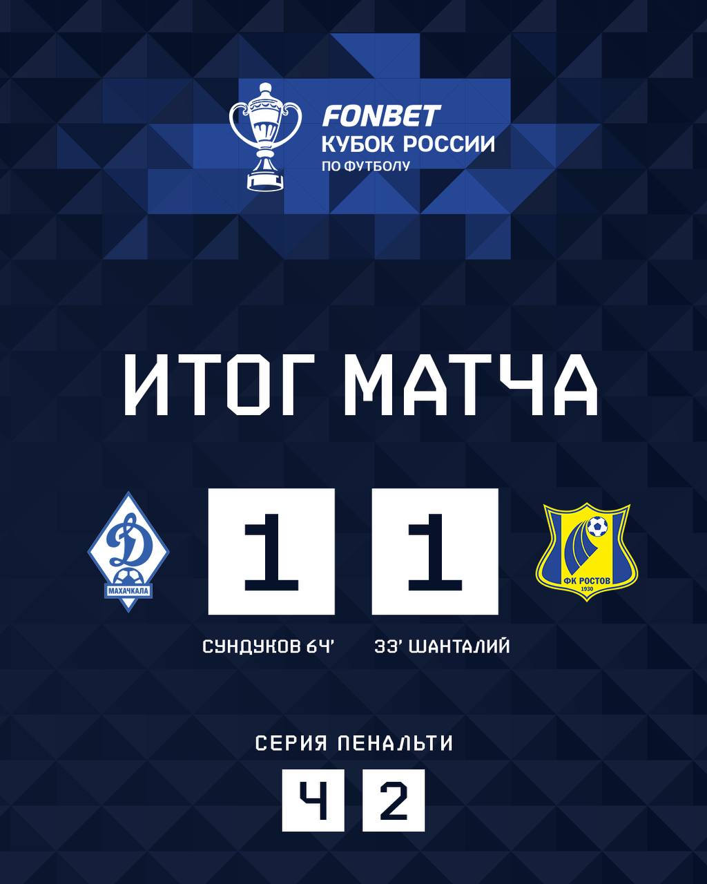Основное время встречи закончилось ничьей, со счётом 1:1, поэтому были назначены пенальти. В нём повели махачкалинцы — 4:2. Не удалось реализовать свои попытки забить мяч Роналдо и Мелёхину.