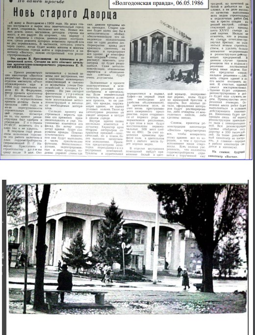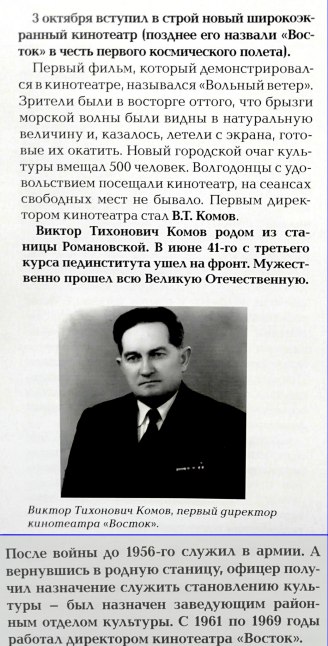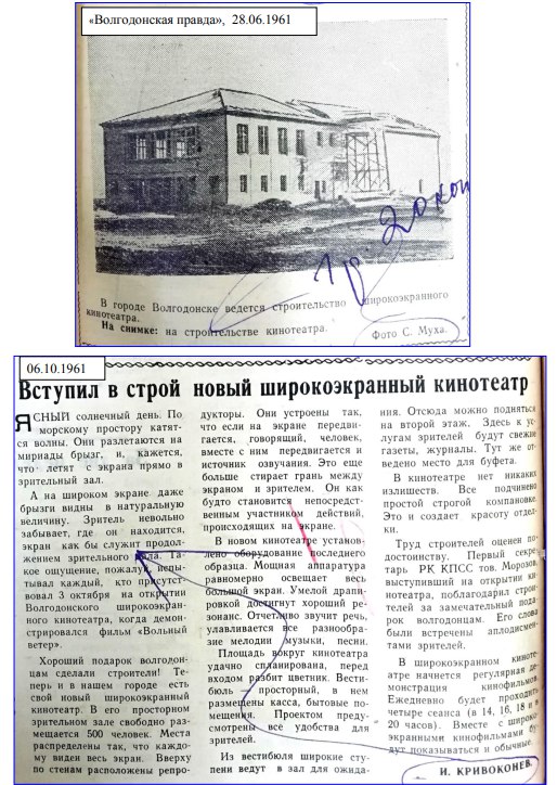 3 октября 1961 года в Волгодонске вступил в строй новый широкоэкранный кинотеатр, названный впоследствии «Восток» в честь первого космического полета. В новой просторном зрительном зале свободно вмещалось 500 человек, на втором этаже к услугам зрителей - газеты и журналы, буфет. В день открытия посетителям демонстрировали фильм «Вольный ветер».