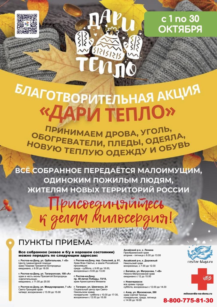 Помочь согреться пожилым и малоимущим людям может любой желающий. В некоторых храмах Ростов, Батайска, Новочеркасска, Азова, Таганрога и хутора Ленина Аксайского района стартовала благотворительная акция, в рамках которой принимают тёплые вещи (новые и б/у, но в хорошем состоянии), пледы и одеяла, а также пожертвования на покупку угля для отопления домов.
