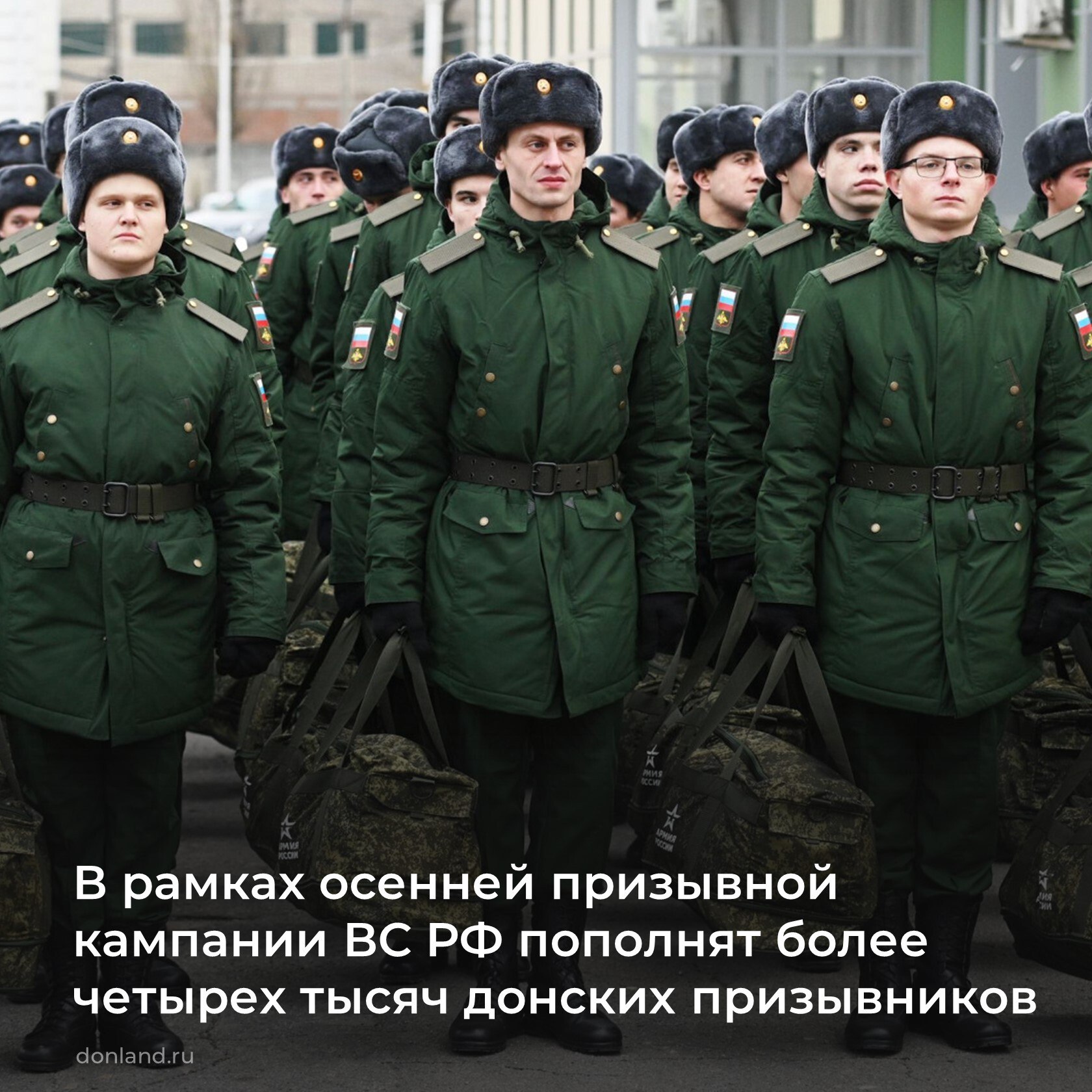 В осеннюю призывную кампанию ряды Вооруженных сил РФ пополнят более четырех тысяч донских призывников. Они будут проходить службу во всех видах и родах войск, при этом порядка 40% в воинских частях на территории Южного и Северо-Кавказского федеральных округов. Традиционно наши призывники пополнят ряды Президентского полка. Также в войска направятся порядка 100 юношей-казаков.