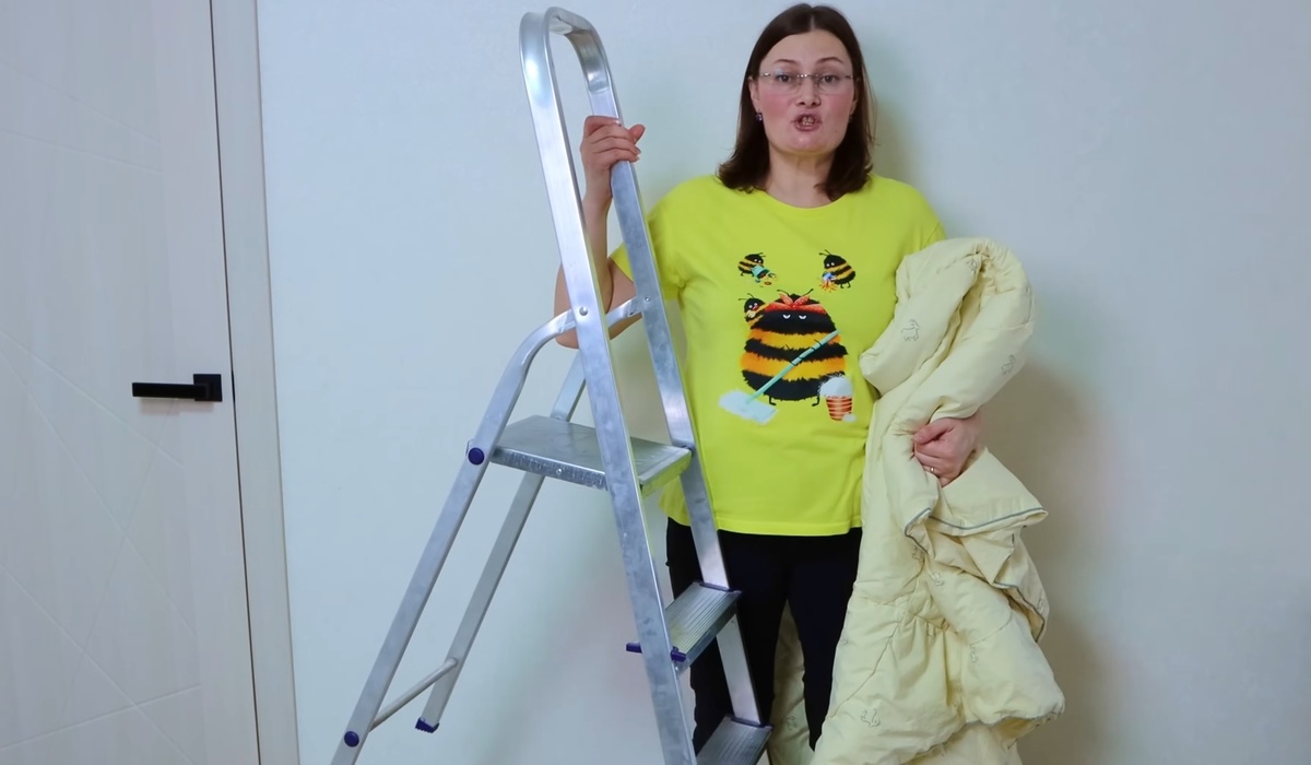 - Использование лестницы или стремянки. Прикрепите одеяло к лестнице высотой около полутора метров, чтобы воздух свободно проходил и влаги становилось меньше. Это поможет быстрее избавиться от воды и добиться равномерного высыхания.