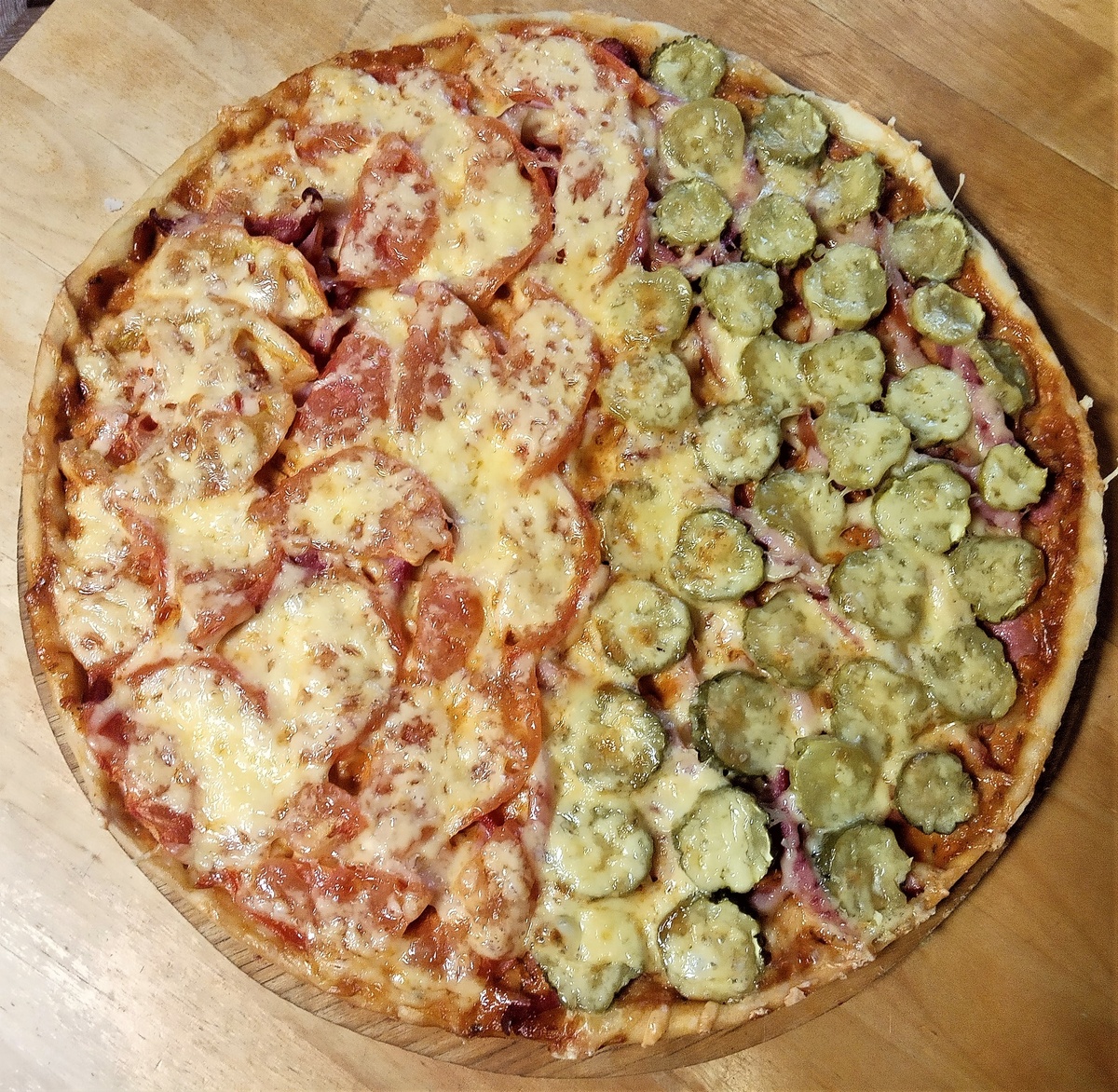 Раскатайте тесто в тонкий корж и разместите его на противне, изначально смазанном подсолнечным маслом. Смажьте основу сметанным соусом и начните выкладывать начинку. На одну половину разместите помидоры, на другую – соленые огурцы, чтобы угодить всем членам семьи. Посыпьте сверху тертым сыром и отправьте в разогретую до 180°C духовку. Время выпекания составляет около 40 минут.
